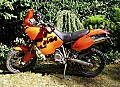 This 640 single is a stolen-recovered, written-off 2004 machine which I rashly bought at auction, sight unseen, a couple of months ago. On the face of it, it was remarkably unscathed as such bikes go, with the missing seat the most obvious part lacking. Closer inspection revealed a complete absence of ignition switch, steering lock, and rack plus a flat battery, broken rear light lens and sundry missing nuts and bolts. A visit to Motorite at Hook got me the required rear light lens and bolts and a visit to Bracken in Bermondsey got me the wrong seat which was nevertheless usable, and a very useful screwdriver-operated old ignition switch. However, this latter visit also brought the revelation that the boys at Bracken were familiar with the bike when it was first recovered and that it had been run very low on oil....which accounted for it being written off. With the battery re-charged and ignition switched on the electronic instruments came to life, revealing that the bike had 12,000 miles on the clock. A squirt of juice down the plughole, a drop more in the tank and the beast fired up and was soon purring like a kitten. Result! I freed off the sticking pads, oiled the chain, bungeed the old Duke seat on and resolved to try the machine out at the Sussex TRF fun day at Langrish on July 15th. The last thing required was a replacement for the bald rear tyre. Fortunately I had a brand new Michelin T63 that had been gathering dust in the garage for years. It was a 130 section instead of a 140, but what the hell. I thought about fitting it myself for about 30 seconds before deciding to take the bike down to Guildford tyres. This was definitely a good decision since it turned out that the existing rear tube had been Finilec-ed. I got the boys at GTs to fit a new heavy duty tube and rim-lock while they were at it. While I was waiting I fitted my brand new rear number plate (very efficiently supplied by Rushden Graphics - www.rushdengraphics.co.uk). The original plate had gone missing when the bike was nicked, but the auctioneers told me the registration; as an unexpected bonus they sent me the original registration document and keys two weeks after I bought the bike. Didnšt have much use for the keys, mind. The filler cap had naturally been mullered and worked with the same screwdriver with which I now turned the ignition on... Late at Langrish Anyway, Elspeth and I finally got to Langrish at about 5pm when the Fun Day was due to finish, but we were still able to do some riding there. Išm never much cop on motocross circuits but I managed a few laps without crashing and bottomed the rear suspension out a few times leaping over the jumps rather than just rolling over them like a complete wuss. I also managed to get the 640 around the mini-enduro circuit, which was a good challenge, especially with 30psi in the rear tyre and the limited lock on the KTM. (Išve since backed off the lock-stop bolts a bit). At one point I stalled the bike and found to my dismay that it no longer started on the button, so I resorted to the kick-starter. Soon after, the magic button came back to life. This has become a recurring theme.