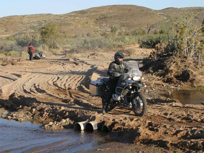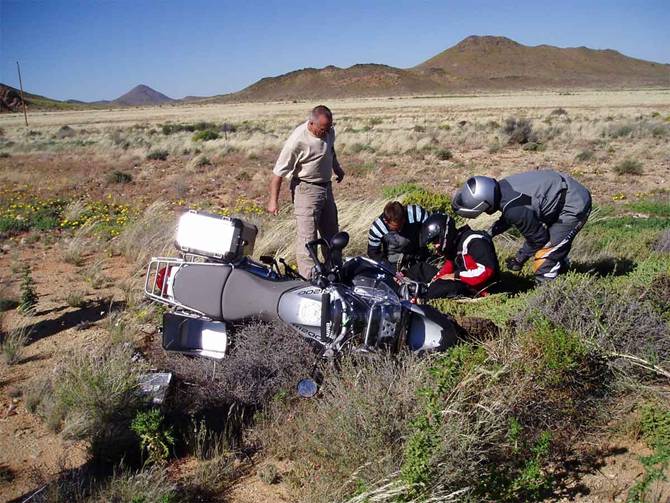 After an hour or so on tarmac we turned west onto our first dirt road, which, like many in the country, was smooth and fast. We then headed north up a more minor and bumpier one. It was on the first real corner of this dirt road that Toni, from the Spanish edition of Men’s Health failed to make the turn and cart-wheeled his bike in the boulder-strewn shrubbery, fortunately without serious damage to man or machine. It certainly provided a good test of the crash bars on the Adventure, and they came through with flying colours! (The only damage was a broken left spotlight and the clip on the left hand-guard snapped as it’s designed to do, while the panniers were severely dented but protected the rear end of the bike). The severely shaken but mercifully intact rider retired to the seat of an X5.