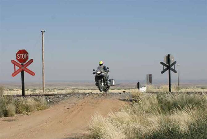 Further up this road there were some soft sandy sections, usually at dry river washouts, which some of the riders found testing, especially the young Italian from Due Ruote magazine who’d never ridden off tarmac before! My own biggest ‘moment’ that first day was on the approach to a level crossing hidden around a sharp 90 degree bend that had been put in so that the road crossed the parallel railway line at a safe right-angle. My heart missed a beat but I recovered in time to take a joyous flying leap off the raised level crossing.
