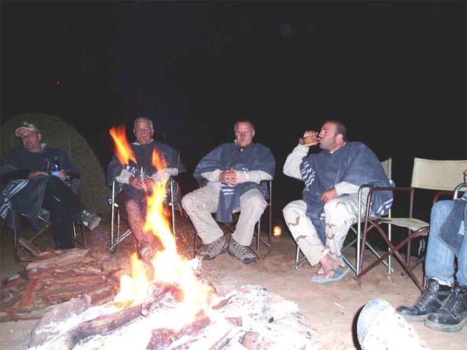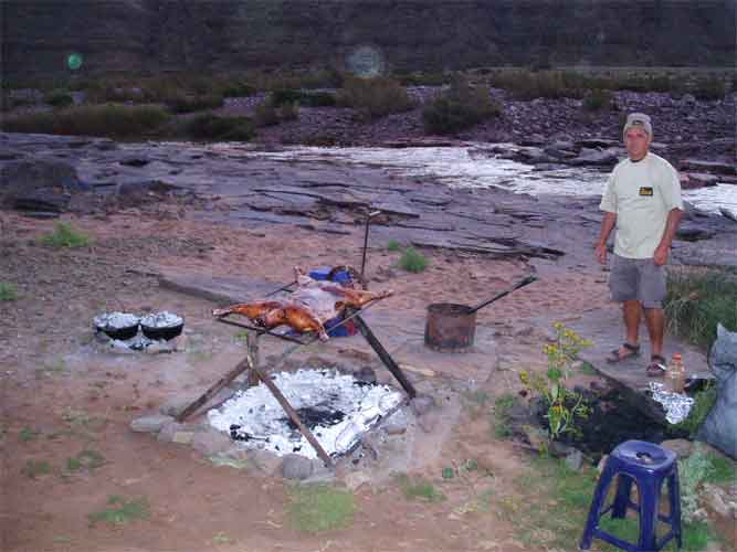 We then rode right down into the valley to the riverside just before dark. A superb temporary camp had been set up there, complete with bar and hot showers! A lamb had been roasting for five hours by the time we arrived and the evening passed quickly around the camp fire as the wheels of international camaraderie were oiled by good food and the odd beverage…
