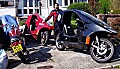 I also stopped off at Jambusters in Hampton, which has recently switched allegiance from Piaggio to Yamaha. John, the MD had also never seen or heard of the Quasar, despite being older than me. The ride back to Ham was much easier at 6.45pm – there was much less traffic, although the A316 was still chokka-block for over a mile to the roundabout at Twickehnham stadium, but the Quasar went between the crawling lines of cars easily. Before replacing the Burger wheel in the scoot, I took some pix of it alongside the Quasar rear wheel – amazing how much wider it is!