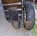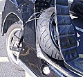 Last Friday, I put my Burger King rear wheel (with mystery air-leak to be fixed) in the back of the Quasar’s seat and rode off to West London Motorcycles in Bedfont in horrendous rush-hour traffic. I got stuck in a queue in East Twickenham – it was impossible to overtake with traffic coming the other way; I let a Ducati Monster through but then got past him on the inside at the lights. The bottleneck only lasted for about half a mile, but it took ages to get through it. I finally fought my way through to the A316 and then made good progress all the way to Feltham. At Feltham station there’s a sharp, downhill left hand hairpin bend with a zebra crossing on it and as I turned gently down it at about 20mph the front wheel started to slide away and I had to make a crash-saving dab with my left foot! I’ve never done that in a Quasar before – I didn’t even know it was possible! Not really sure why it slid though – I presume it was on some spilt diesel or something similar.