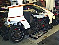 Apparently the GS Phasar is actually too long for the MB dyno, but a standard Quasar just fits on. I got to ride it myself on the dyno, which was quite exciting! I took it to 5,400rpm in top and a theoretical 112mph –and was pleased to discover that the rev counter and speedo are both spot on. What wasn’t so pleasing was the actual number of gee-gees getting to the ground. Bearing in mind that the Reliant engine is now running better than at any time since I bought the bike a year ago, and that it has actually made a GPS-checked 100mph on the road, I was confident that it would make at least 30 rear wheel bhp. Unfortunately this turned out to be somewhat optimistic! The plain truth is that it made just 25rwbhp, albeit with a torque curve like a Harley, as you might expect. This is actually less outright horsepower than the fuel-injected Mk3 Burger 400 that I tested a couple of years ago – that made 26bhp from a single cylinder of just 385cc! The fact that it actually managed to achieve 100mph on the road despite having so little power and so much weight, just goes to show how aerodynamic the Quasar is. My Mk1 Tmax never quite managed to crack the ton with 31rwbhp. It also chimes with the 1977 road test of a Quasar in New Motorcycling Monthly – the orange one they tested broke the MIRA timing lights at 101mph.